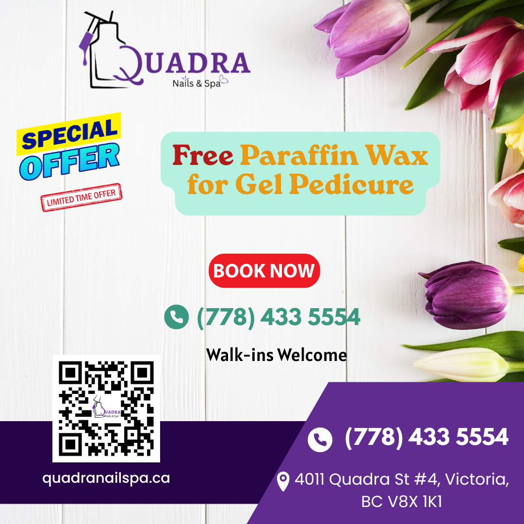 Quadra Nails & Spa is a top-rated nail salon in Victoria, BC nestled at 4011 Quadra St #4 in Victoria, BC V8X 1K1, where beauty and relaxation seamlessly converge. With their skilled team and a commitment to excellence, Quadra Nails & Spa offers a wide range of services to pamper and rejuvenate you. Whether it's a relaxing manicure, a luxurious pedicure, or other beauty treatments, you can trust their expertise to leave you feeling refreshed and revitalized. Give them a call at (778) 433 5554 to book your appointment and experience the ultimate in self-care and indulgence. Your nail salon near you.